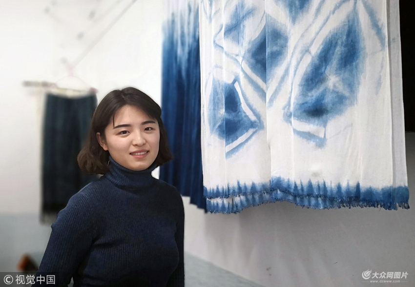 2017年12月20日,山東威海。為減輕父母壓力、不愿再向家里伸手要生活費,張萍萍利用專業(yè)特長在學(xué)校創(chuàng)業(yè)園里支起染缸,開起了“染坊”。