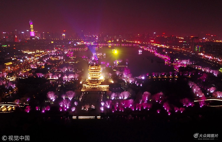 2017年12月27日晚6點(diǎn),濟(jì)南大明湖景區(qū),近日新安裝的千萬(wàn)盞彩燈首次全面亮燈調(diào)試。地面、樹(shù)木、水邊、建筑物上的彩燈全部點(diǎn)亮,激光也在空中畫(huà)出奇幻的圖案,整個(gè)大明湖景區(qū)猶如夢(mèng)境。