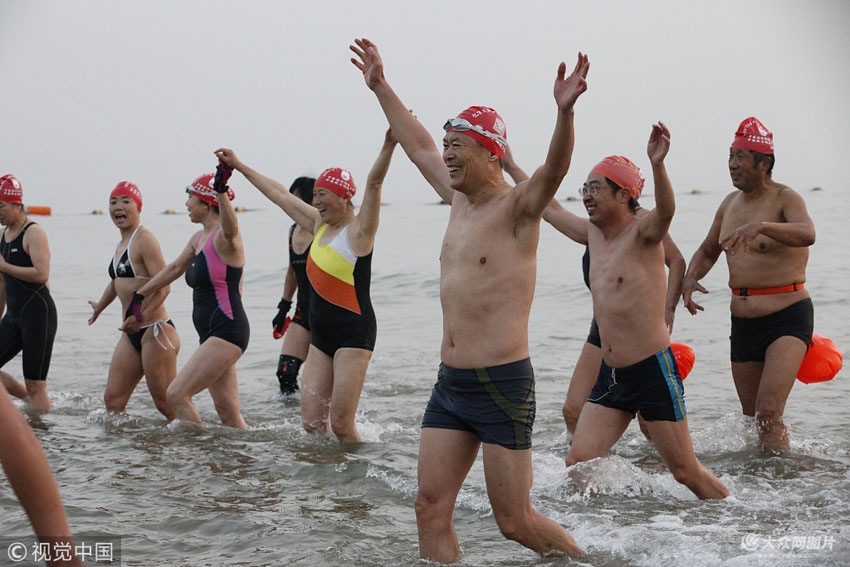 1月1日清晨,日照市萬平口海濱,冬泳愛好者冒著-1℃的低溫,下海沖浪,洗塵過去的一年,為新年祈福。