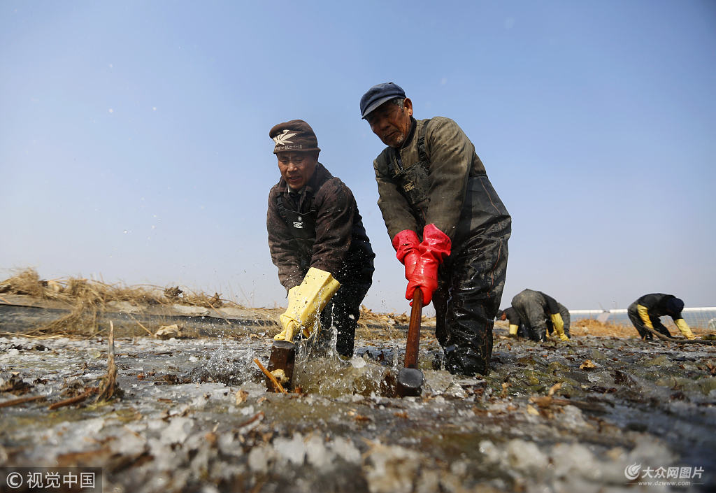 組照說明:2018年1月29日,山東臨沂,在山東省沂南縣銅井鎮新王西村一處藕塘,藕農用鐵錘將藕塘內的冰面砸開。寒冬臘月,山東省沂南縣銅井鎮的千余畝藕塘已經結冰。當地藕農冒著零下十攝氏度的低溫進入藕塘,用鐵錘砸開冰面,再用高壓水槍噴淋塘泥,半身泡在刺骨的冰水中抓緊采挖,確保蓮藕在春節期間充分供應市場。