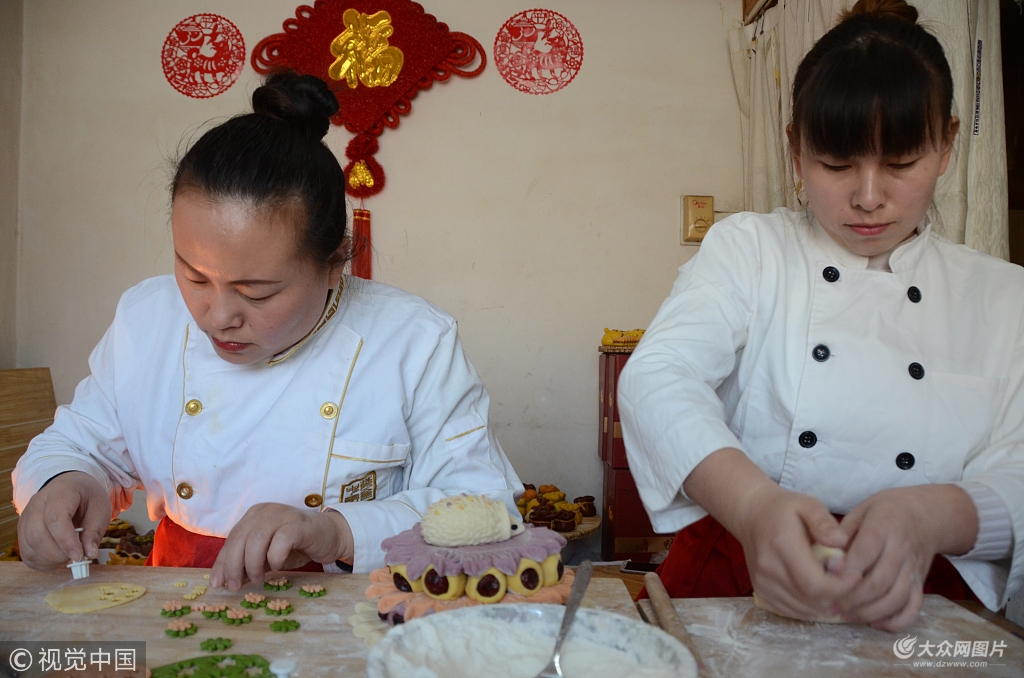 2018年1月29日,山東省聊城市東昌府區居民高玉(左)和妹妹高芳(右)正在制作花糕。