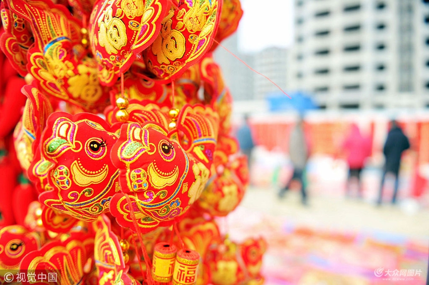 2018年1月30日,山東青島西海岸新區(qū)一農(nóng)村大集,市民在購(gòu)買福字和春聯(lián)。