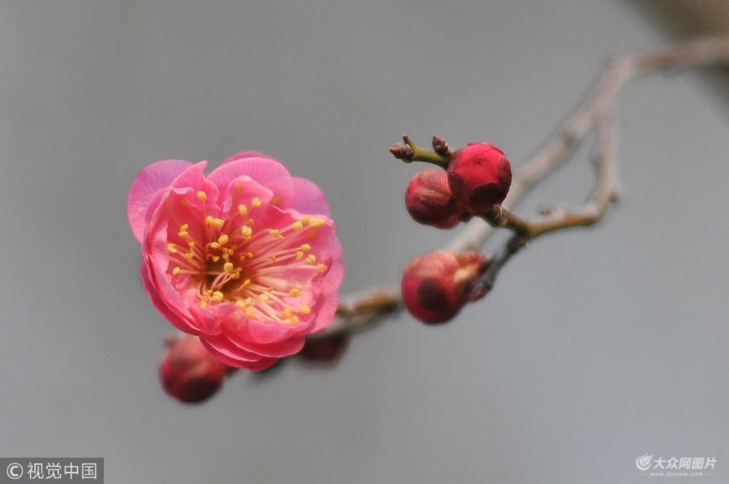 2018年3月11日,青島市氣溫回升“提速”,梅花悄然開放吸引游人拍照。