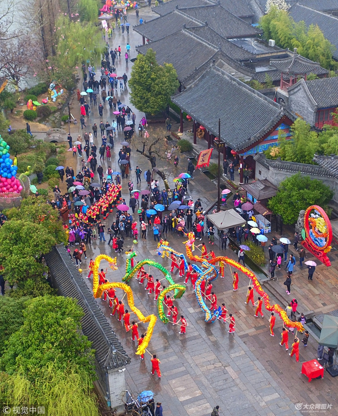 2018年03月18日,山東棗莊,在臺兒莊古城開河祈福大典上,民間舞龍隊正在表演“龍抬頭”。