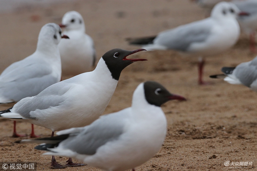 2018年3月20日,人們?cè)谏綎|省青島棧橋景區(qū)賞海鷗。