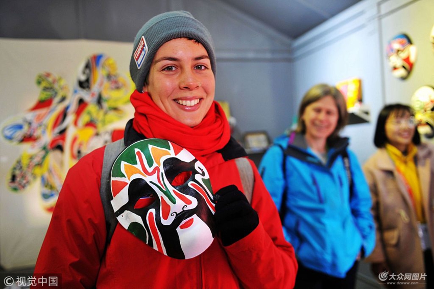 2018年3月21日,山東青島西海岸新區非物質文化遺產展示體驗中心,克利伯環球帆船賽部分船員在參觀京劇臉譜制作。