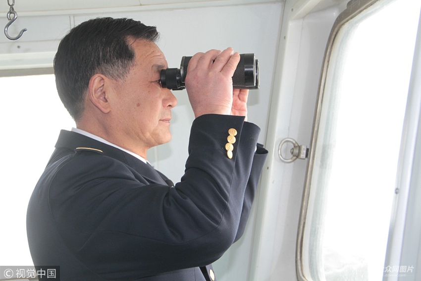 2018年3月22日,青島。他叫陳華飛,是北海航海保障中心青島航標(biāo)處海巡1501輪的老船長(zhǎng),從業(yè)近40載,每天都以船為家,守護(hù)著青島附近海域的600多個(gè)航標(biāo),在茫茫大海上為過(guò)往船只鋪好道路、指明方向。一把方向舵、一處3尺指揮臺(tái)就成了他最平凡的一生。圖為老船長(zhǎng)陳華飛在用望遠(yuǎn)鏡觀察附近海域。