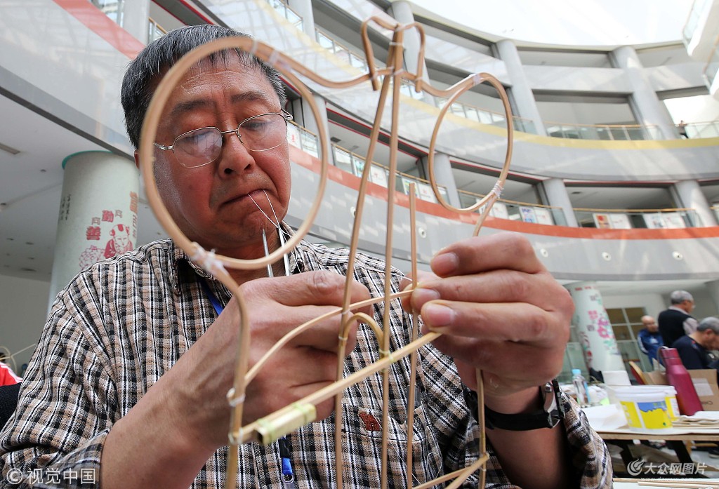 2018年4月24日,山東省濰坊市,風箏扎制參賽人員正在緊張的扎制傳統風箏。圖片作者:張馳/視覺中國