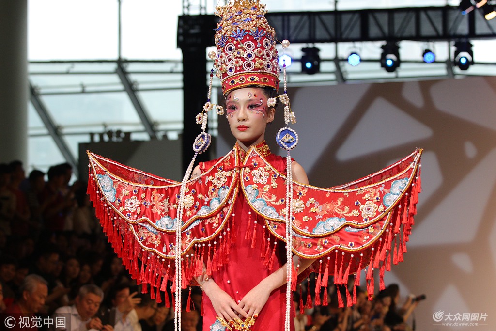 組照說明:2018年5月17日,山東省濟南市,山東工藝美術學院2018年畢業展服裝秀在舜耕國際會展中心隆重拉開帷幕,身材高挑的模特身穿2014屆畢業生設計的各式服裝在T臺上走秀。其中,古裝展示部分大玩穿越,各路神仙輪番出場,令觀眾大呼過癮。