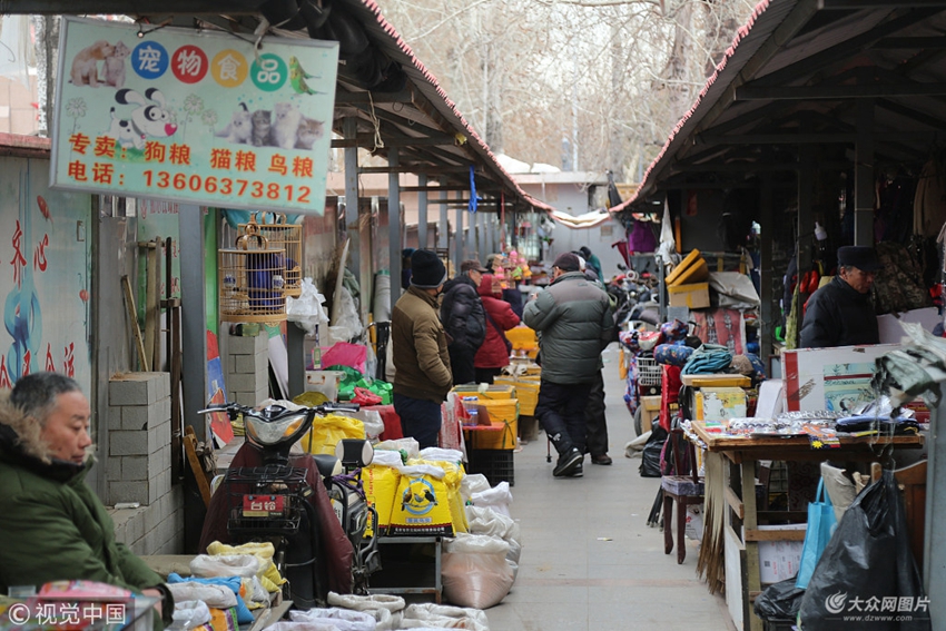 2019年1月9日,山東濟南英雄山北側市場內聚集很多人,白色泡沫箱子上面蓋著透明的玻璃,箱子內整齊擺放著形狀各異的瓶瓶罐罐,里面裝著蟈蟈。
