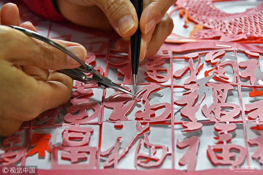 2019年1月10日,山東煙臺(tái),剪紙藝人衛(wèi)愛(ài)君在創(chuàng)作剪紙作品《百福圖》。