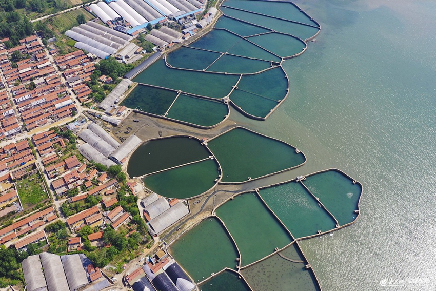 2019年6月11日,山東青島西海岸新區董家口經濟區,航拍陳家貢灣的美景,在陽光的作用下,連綿的養殖池里的海水呈現出藍色和綠色兩種迷人上午顏色,宛如“藍綠寶石”一樣美不勝收。