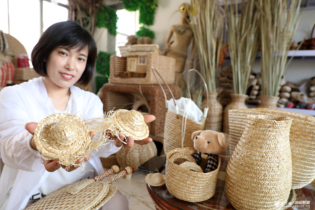 2019年6月16日,在山東省濱州市博興縣錦秋街道灣頭村,農民王貴芝展示使用小麥秸稈為原料編織的傳統工藝品。