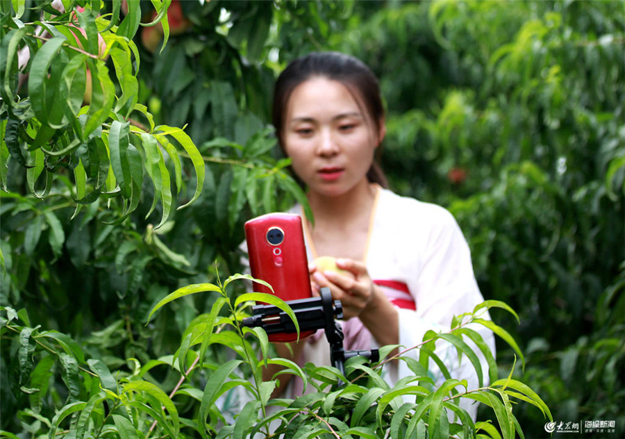 2019年7月9日,在山東省臨沂市平邑縣地方鎮源豐家庭農場,韓梅在桃園里進行網絡直播。