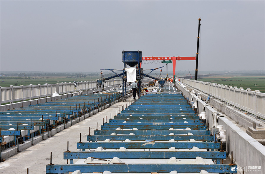 2019年7月10日,青島。在中鐵上海局濰萊高鐵項目部無砟軌道施工現場,建設者不畏酷暑,加快施工進度,以確保年底全面完成主體工程建設任務。