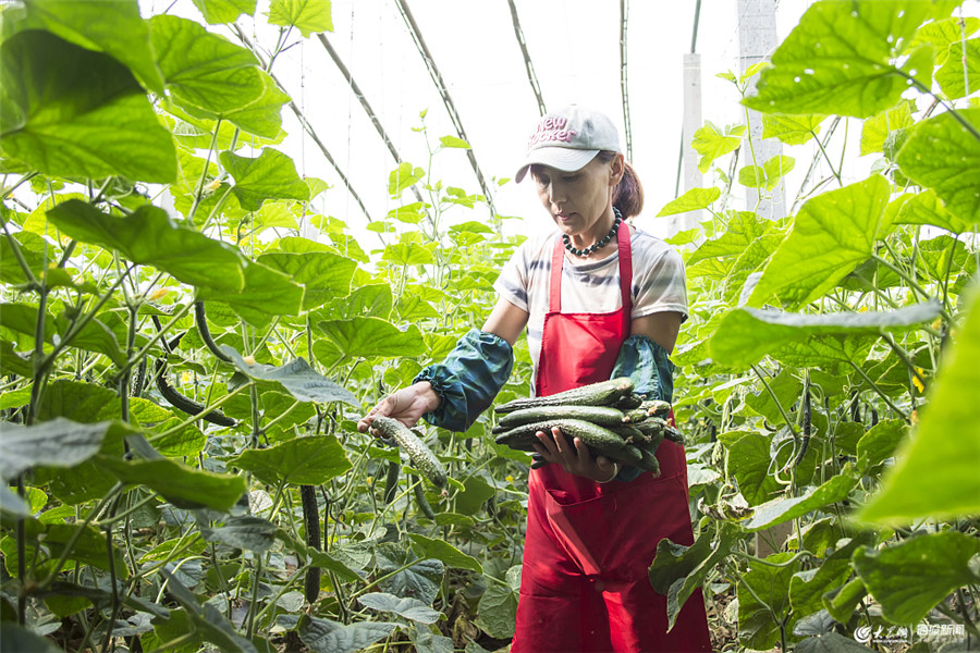 2019年7月11日,山東濱州,在楊柳雪鎮西辛莊村的黃瓜大棚里,村民高永霞正在熟練地摘著黃瓜,趕在上午九點之前將最新鮮的黃瓜送到市場。
