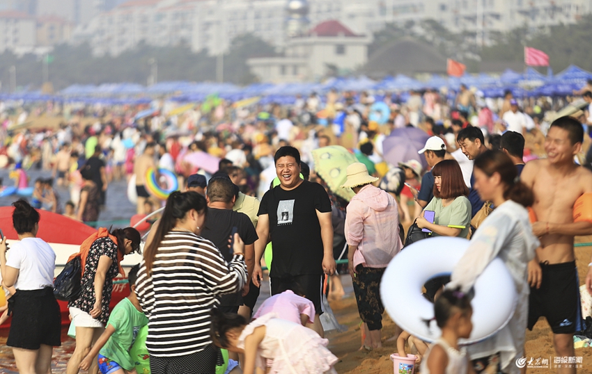 2019年7月14日,山東威海國際海水浴場,數(shù)以千計的游客在海邊避暑,盡享清涼,一年一度的海邊“下餃子”模式再次開啟。