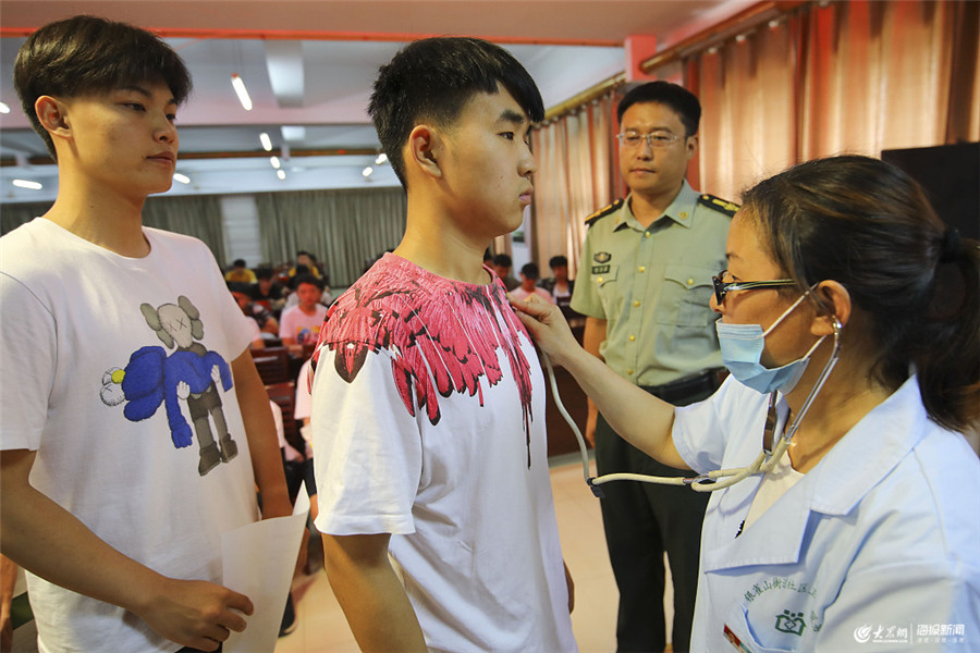 2019年7月21日,山東臨沂,應征青年在銀雀山街道征兵體檢站參加體檢初檢。