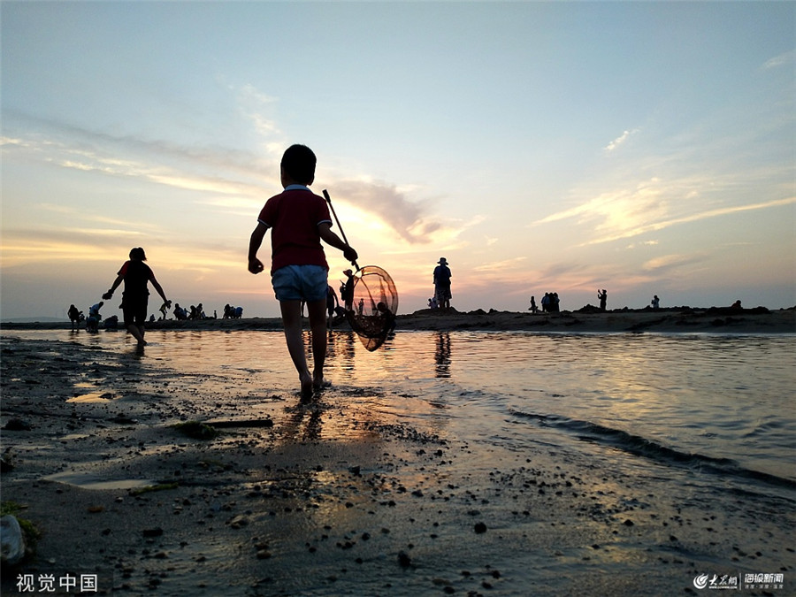 2019年7月23日,山東威海,當日是大暑時節(jié),游客紛紛到那香海海邊避暑游玩,夕陽西下剪影美如畫。