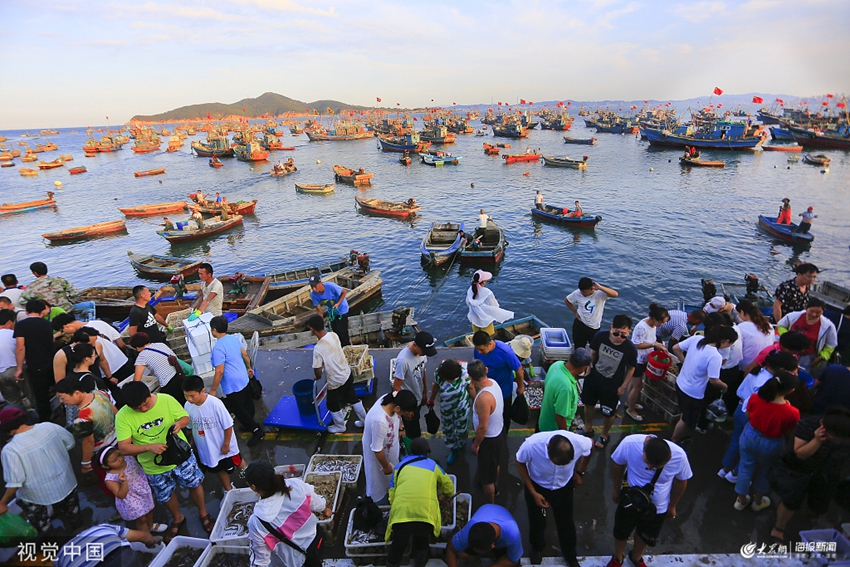 2019年9月1日,山東威海合慶漁港碼頭,漁民正在把近海捕撈的海鮮送上岸,市民正在購買海鮮。當日,為期4個月的伏季休漁結束,威海大大小小5000多漁船相繼出海撒下開海第一網,岸上的市民早早的等待著,成千上萬的市民在合慶漁港碼頭搶購開海第一網海鮮。今年開海后近海捕撈以“蝦兵蟹將”等小魚蝦為主,價格較往年相對較低,市民可以大飽口福,品嘗這“開海第一鮮”。