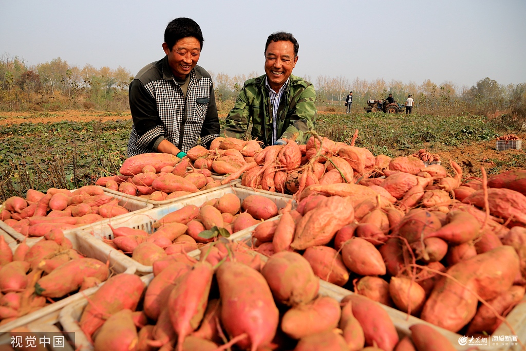 2019年10月23日,在青島西海岸新區(qū)六汪鎮(zhèn)青島祝茲侯生態(tài)農(nóng)業(yè)觀光園,農(nóng)民在田間收獲“蜜薯”。