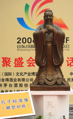 首屆山東文化產業博覽會有一個顯著特點就是大打"孔子牌"。主辦者在海內外開展了征集孔子標準像活動。在"孔子像標準設計方案"中,主辦方對征集的孔子像提出了一些要求:尊重歷史依據、約定俗成印象,準確體現其偉大思想家、教育家及中國傳統文化形象代表身份,形神俱佳;其神態要求以唐代吳道子的孔子像為樣本;在形象上,服飾、姿勢以孔子行教圖為依據;年齡掌握在60歲至70