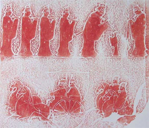 我們曾見過《孔子見老子》的拓片。其真正的畫像石長169厘米,高37厘米,現鑲嵌于濟寧市鐵塔寺東院東屋南墻。孔子和老子都頭戴斜頂高冠,略為躬身。老子在右,孔子在左。老子手中拄一根拐杖,孔子手里捧著一只雁,這是他送給老子的見面禮。他們的身后都有馬車和侍者,可惜因畫面過于抽象,難以辨清人物形象。
