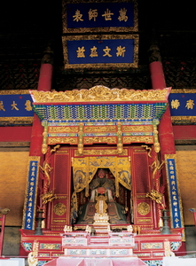 曲阜孔廟大成殿內的孔子像就頭戴十二冕旒,身著十二章服,凜然獨立,像前之木主上也寫上"大成至圣先師之位"。這是一種帝化和神化孔子的形象。