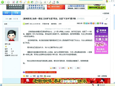 對(duì)這個(gè)結(jié)果,劉女士稱(chēng)自己“冤得沒(méi)處去說(shuō)理”。她告訴記者,自己2008年6月到這個(gè)服務(wù)區(qū)做清潔工,也對(duì)服務(wù)區(qū)內(nèi)裝有監(jiān)控的事很清楚,自己不可能在監(jiān)控的監(jiān)督下,還將撿到的錢(qián)包據(jù)為己有。“我憑良心講話,一個(gè)女人,哪會(huì)想得那么復(fù)雜,怎么會(huì)做這種事?”她對(duì)公司將自己解聘憤憤不平,“我撿了錢(qián)包,分文不少還給了人家,現(xiàn)在還把我開(kāi)除了。真是好事做不得,做了好事也會(huì)成壞事……”