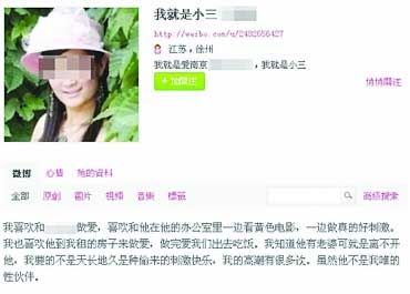 [提要] 最近一段時間,一位網名為“我就是小三鄭某某”的網友,在微博上發布了多條言語赤裸的微博,引發了不少網友的關注。