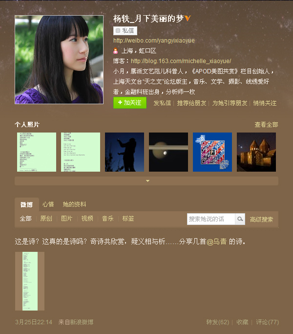 在隨后發表的微博里,楊軼表示,如果烏青的作品被稱作是詩,那么我們身邊所有形式的語言和文字都是詩,甚至包括夢中的囈語和吃飯時的咀嚼。她更說道,“如果拼湊幾句廢話就能成為‘詩人’,還不如打開電視看廣告。”