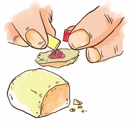 饅頭派:將饅頭或發(fā)糕捏成凹片,擰開膠囊倒藥進(jìn)去捏口成團(tuán),吞掉。