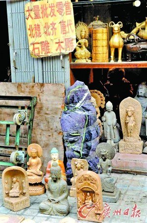其實初來者很難想象會有這么多的“文物”。在一家經營古玩的小店,門口竟然公開寫著:北魏唐代石像大量批發,店里成堆擺放著風格迥異的石像和斑駁缺損的石雕;沾滿灰土的陶塑與泛著綠銹的銅像,似乎都飽經歷史風霜。經過詢問價格,便宜的數千元,最貴的也不過三四萬。不過黃伯提醒說,“不懂就不要買,真貨是不會擺出來賣。這樣交易就是吸引那些看見喜歡就買的外行,真正的珍貴文物買賣大都是私下熟客交易!