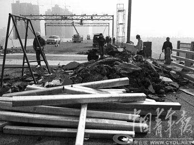 [提要] 12月28日,記者在二七長江大橋上看到,一些地方的伸縮縫還在挖掘過程中,各種建筑材料到處堆積,工地上非常忙亂。12月中旬,這些質疑甚至似乎獲得證實,因為有廣播電臺記者采訪到“武漢城投公司二七大橋總工”易江鴻,易的講話似乎證實“搶工期”的問題確實存在。