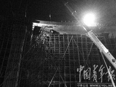 12月26日晚8時,二七長江大橋引橋武昌段和平大道處,記者看到在高架橋下,鋼管扎成的腳手架仍然仍然林立著,有工人在上面施工。本報記者 葉鐵橋攝