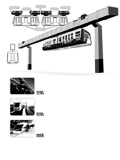 “空軌”屬于城市快捷公交,是懸掛式單軌交通運輸系統。軌道位于列車上方,由鋼鐵或水泥立柱支撐,列車被吊在半空中行駛。