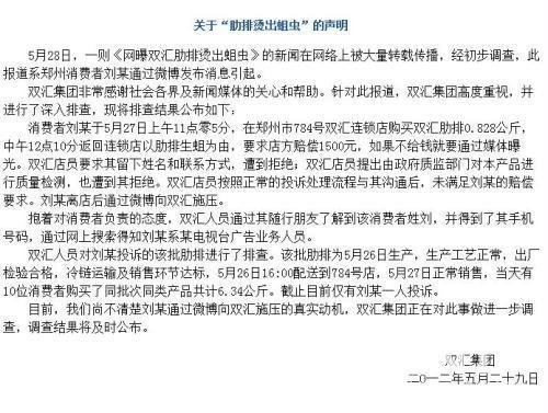 聲明稱:11月(本網注:應為5月)27日中午12:10一顧客到豐產路政七街雙匯784店,端著一鍋湯說:剛剛在門店買的排骨中有生蛆現象。店長接待時,顧客提出兩個條件:一是給予500元的賠償,二是媒體爆光(本網注:曝光)。店長請示后王督導趕到現場請示情況,顧客不聽仍堅持兩個條件,區域經理及商業公司營運部應部長隨后趕到現場。四級負責人當場復核,查看相關單據和貨品,確定脊骨和大肋排為新到貨產品,鮮度非常好。現場試驗柜內顧客所買同批次商品,開水燙后無任何顧客描述問題,認為顧客投訴存在較大嫌疑。雙匯先后提出顧客留樣,檢測部門送樣品給予適當補償等解決方法。而顧客再次提出;要求補償1500元(500元為商品補償,1000元為精神補償),并說現場現金補償后可將手中照片刪掉。