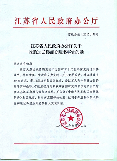 江蘇迅即應對,省人民政府辦公廳昨日緊急向北京市文物局發出《關于收購過云樓部分藏書事宜的函》,函中寫道:江蘇鳳凰出版傳媒集團作為國有骨干文化單位競購過云樓藏書,得到省委、省政府全力支持,并已競拍成功。過云樓藏書3/4在南京,現1/4成功競購回歸江蘇,是江蘇人民也是社會輿論的呼聲和企盼。省政府確定此項收購由國有文博單位南京圖書館和江蘇鳳凰出版傳媒集團實施,并依據《中華人民共和國文物保護法》相關規定,指定南京圖書館收藏,以利于開展整體學術研究和通過再出版開發其重大文化價值。
