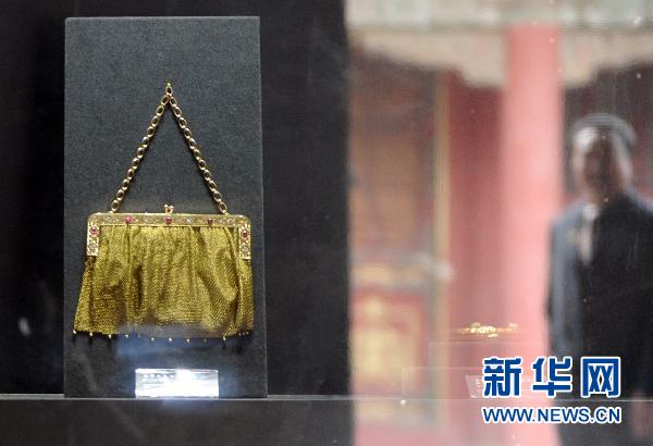 這是香港兩依藏博物館在故宮內(nèi)展出的金絲嵌寶石手袋(4月26日攝)。當(dāng)日,北京警方證實(shí):北京故宮博物院發(fā)生部分展品失竊事件。據(jù)警方通報(bào),5月9日,北京警方接報(bào)稱,香港某博物館在故宮博物院臨時(shí)展出的部分展品失竊。經(jīng)初步調(diào)查,丟失物品為該博物館在故宮博物院臨時(shí)展點(diǎn)內(nèi)展覽的現(xiàn)代工藝品。目前,警方正在進(jìn)一步調(diào)查中。新華社記者金良快攝