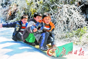 昨日天氣明顯好轉,冰雪已經(jīng)開始融化,三名小學生在村前結冰的路上用自制的“撬板”玩冰橇。記者陳楓攝