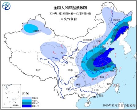 預計,12月23日14時至25日14時,新疆北部、西北地區中東部、內蒙古東部、東北、華北、黃淮、江淮、江漢、江南大部、四川東北部、重慶大部、貴州等地將出現6~8℃降溫,其中,華北南部、黃淮、江淮、江漢、吉林中東部、遼寧中東部等地的部分地區降溫幅度可達10~14℃;上述大部地區有4~6級偏北風。