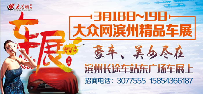 大眾網濱州2月17日訊(記者 王君彩)冬天已經遠去,春暖花開的時節即將來臨,這個時候您更需要一輛愛車,帶著家人一起踏青賞景。3月18日至19日,大眾網濱州頻道首屆車展將在濱州長途汽車站東廣場開幕,屆時將為您奉上最精致的車型、最優惠的價格,現場還將舉辦尋寶大賽、實景搜紅包、COSPLAW車模拍客大賽以及相親大會等活動,讓您成功購置心儀愛車的同時,收獲豐厚大禮。敬請關注,期待精彩!