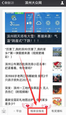 在微信頁面“添加朋友”,“查找微信公眾賬號”一欄搜索濱州大眾網,關注濱州大眾網并點擊下方菜單欄“相親會報名”,提交相關信息(姓名、性別、年齡、聯系方式、自我介紹、擇偶標準等),即可報名成功。