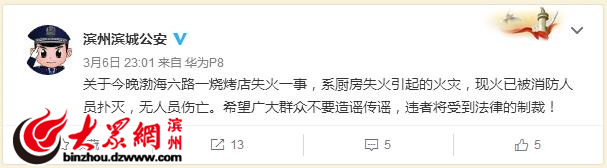 之后,濱城區公安分局官方微博“濱城公安”迅速發布信息,稱該燒烤店失火一事系廚房失火引起的火災,火災已經被消防人員撲滅,無人員傷亡。望廣大網友不造謠、傳謠,違者將受法律的制裁,并規勸相關違法人員投案自首。