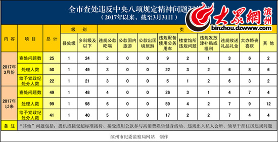 統計數據顯示,2017年1至3月份,濱州共查處違反中央八項規定精神問題49起,違規公務用車問題達到了26起,鄉科級以下級別違規問題48起;99人因違反中央八項規定被處理,黨政紀處分41人。