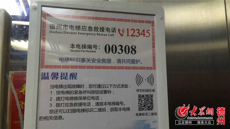 “平臺的建成使用,是加強公共服務、滿足群眾安全乘梯的必然要求,也是轉變政府職能、改革創新安全監管模式的現實需要。”德州市質監局局長、黨組書記苗曉鋼介紹,目前,全市13個縣(市、區)55家維保單位7050部電梯已經錄入德州市電梯困人應急救援處置平臺系統,系統內的每臺電梯內部均安裝了的“電梯標識牌”,上面印有電梯編號、維保單位、年檢時間、維修電話等相關信息的二維碼,相當于每一部電梯的“身份證”,明確了電梯安全管理主體責任。同時,電梯發生故障時,轎箱內被困乘客可撥打市民熱線“12345",被困乘客向接線員報出電梯識別碼,接線員即可定位電梯所處詳細位置。一旦接到救援或12345的調度電話,救援人員在市區30分鐘內,市區外1小時內趕到現場處置,保障乘客困梯后得到快速解救。“截至目前,應急救援數據匯總顯示,全市共接到熱線74個,處理電梯突發事件36件,解救被困人員63人,達到了快速反應、處置及時的運行效果。”
