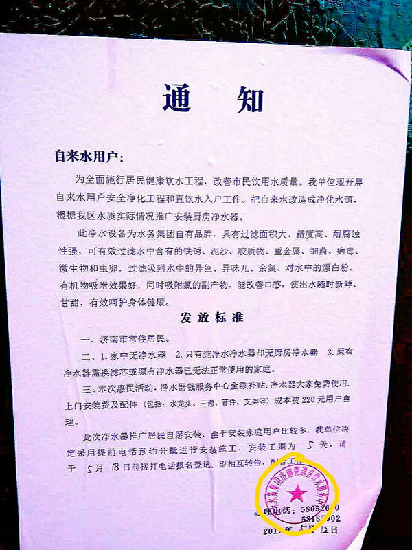13日,記者見到了張貼在部分小區內的這個“通知”。“通知”顯示:我單位現開展自來水用戶安全凈化工程和直飲水入戶工作。把自來水改造成凈化水源,根據我區水質實際情況推廣安裝廚房凈水器。此凈水設備為水務集團自有品牌……本次惠民活動,凈水器錢服務中心全額補貼,凈水器大家免費試用,上門安裝費及配件成本費220元用戶自理……