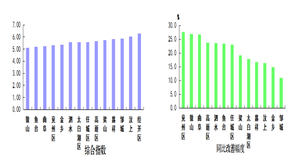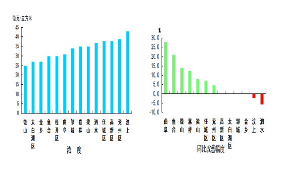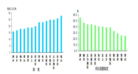 二氧化氮濃度最好的縣(市、區)是微山縣,為25微克/立方米;最差的縣(市、區)是汶上縣,均為43微克/立方米;同比改善幅度最大的縣(市、區)是曲阜市,為27.9%,同比惡化幅度最大的縣(市、區)是泗水縣,為5.7%。