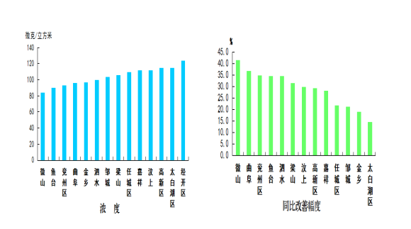 可吸入顆粒物濃度最好的縣(市、區)是微山縣,為84微克/立方米;最差的縣(市、區)是經開區,為124微克/立方米;同比改善幅度最大的縣(市、區)是微山縣,為41.7%,同比改善幅度最小的縣(市、區)是太白湖區,為14.8%。