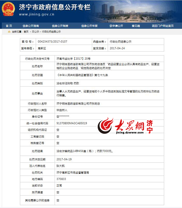 據悉,濟寧明珠醫藥連鎖有限公司濟東藥店因從無藥品生產、經營資格的個人手中購進實施批準文號管理的處方藥非處方藥,濟寧高新區市場監督管理局依據《中華人民共和國藥品管理法》第七十九條,對其進行沒收涉案藥品14種456盒(瓶),罰款7000元的處罰。